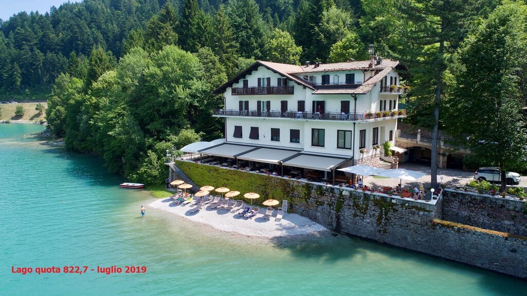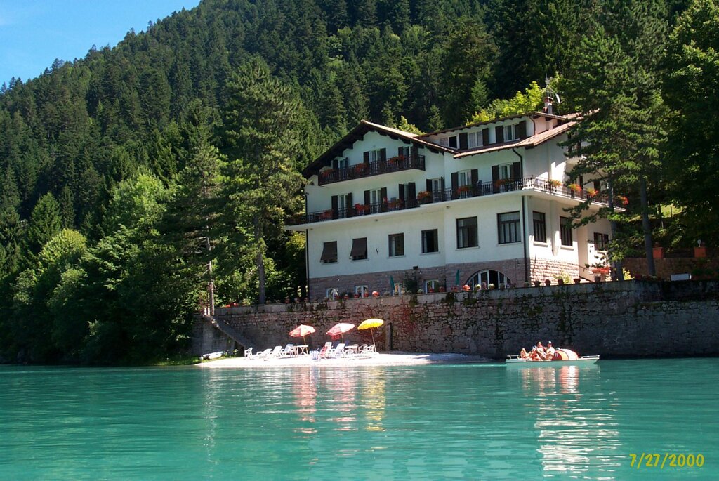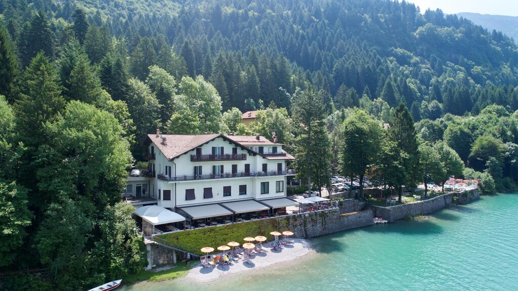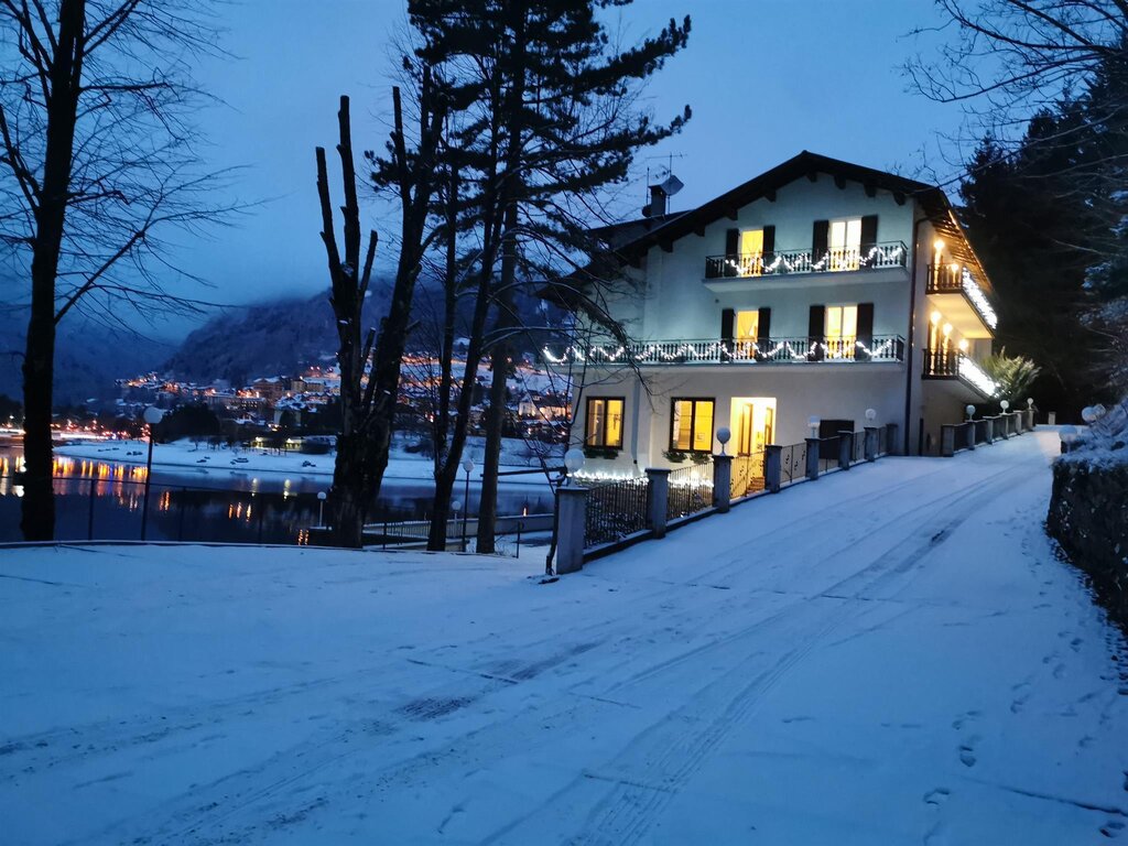 In riva al lago di Molveno. 5000 mq di parco, giardino e veranda, con stupendo panorama sulle Dolomiti di Brenta, sul paese e sul lago. Paganella Guest Card inclusa nel prezzo. Lontani dal traffico e dai rumori, siamo una base di partenza ideale per le passeggiate sulla Paganella e nel Parco Adamello Brenta. Stanze con servizi privati, telefono, TV con satellite, cassaforte, phon. Cene con ampio menù e buffet di apertura. Una panoramica passeggiata in riva al Lago (800 metri) collega l'albergo al centro paese. L'albergo si trova a 27 km dall'autostrada, a 1 km dalla fermata degli autobus e a 1,5 km dagli impianti di risalita. Romantico hotel in riva al lago di Molveno con incantevole panorama sulle Dolomiti di Brenta: piscina, spiaggia, pedalò, biciclette gratuiti. A vostra disposizione 5000 mq di parco, bosco, giardino e veranda.