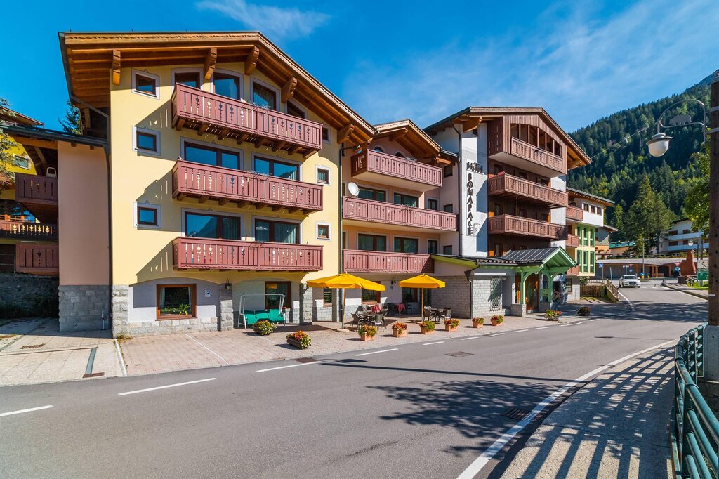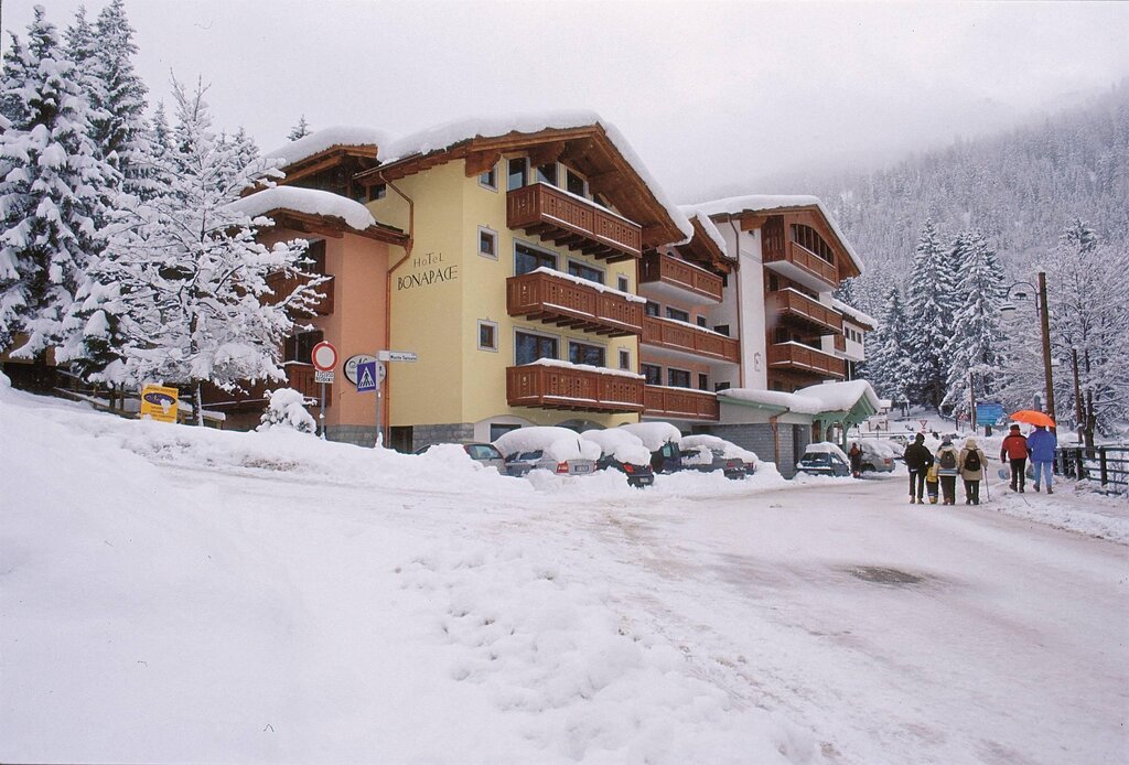 Benvenuti agli Appartamenti Bonapace! Autenticità, libertà e comfort sulle Dolomiti Immagina di svegliarti con un profumo di Bona Pace che si libra nell'aria, affacciato su un balcone con vista sulle Dolomiti di Brenta: benvenuto a Madonna di Campiglio, benvenuto ai tuoi Appartamenti Bonapace. Qui da noi hai tutto lo spazio e l’indipendenza di una casa — angolo cottura completo, soggiorno con divano letto, Wi‑Fi in fibra, TV, lavastoviglie, lavatrice in comune, e biancheria di qualità già pronta al tuo arrivo — insieme ai servizi di un hotel (a pagamento), grazie alla vicinanza con l’Hotel Bonapace ed il suo ristorante e centro wellness. Il ristorante è prenotabile compatibilmente con la disponibilità. Appartamenti indipendenti (bilocali, trilocali o quadrilocali, fino a 7 ospiti), con tutto ciò che serve per sentirsi come a casa. Vicinanza a piedi agli impianti (300 m al Monte Spinale), al centro paese (700 m), al laghetto di Campiglio (100 m): libertà totale senza auto. Pulizia accurata iniziale e finale del soggiorno, set di asciugamani/lenzuola, posto auto riservato per ogni appartamento. Vuoi rilassarti? L’Hotel Bonapace è lì: aperitivo al bar, spa, piscina, giardino estivo e servizio navetta per gli impianti in inverno. Sia che tu ami il silenzio delle escursioni estive, sia il ritmo veloce degli après‑ski in inverno, qui trovi uno spazio tuo: cucini quando vuoi, ti muovi senza vincoli, festeggi o ti rilassi nel giardino in completo silenzio. E se viaggi in famiglia, ogni membro ha il suo angolo per piaceri e pause personali. Le Dolomiti di Brenta ti daranno molto più di un panorama: aria pura, silenzi rigeneranti, paesaggi che cambiano con le stagioni. Campiglio è patrimonio Unesco e un ospite d’onore delle destinazioni più amate. Pur essendo strutture diverse, la filosofia è la stessa dell’Hotel Bonapace: sostenibilità autentica, rispetto per il territorio, energia rinnovabile, filiera corta per la colazione. L’impegno ambientale è parte del nostro DNA. Scegli la libertà di una casa sulle Dolomiti, con il comfort e i servizi di un hotel. Relax, natura, indipendenza e un’anima eco‑friendly ti aspettano in Appartamenti Bonapace.